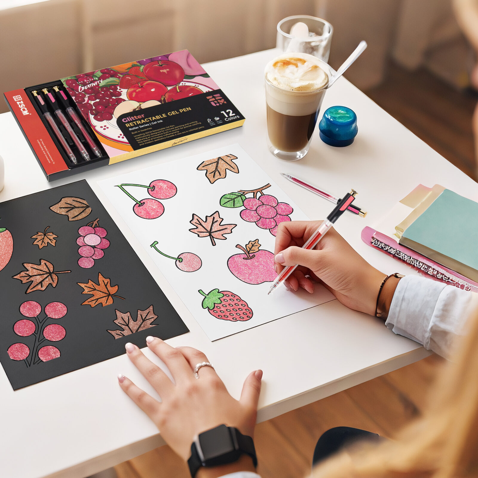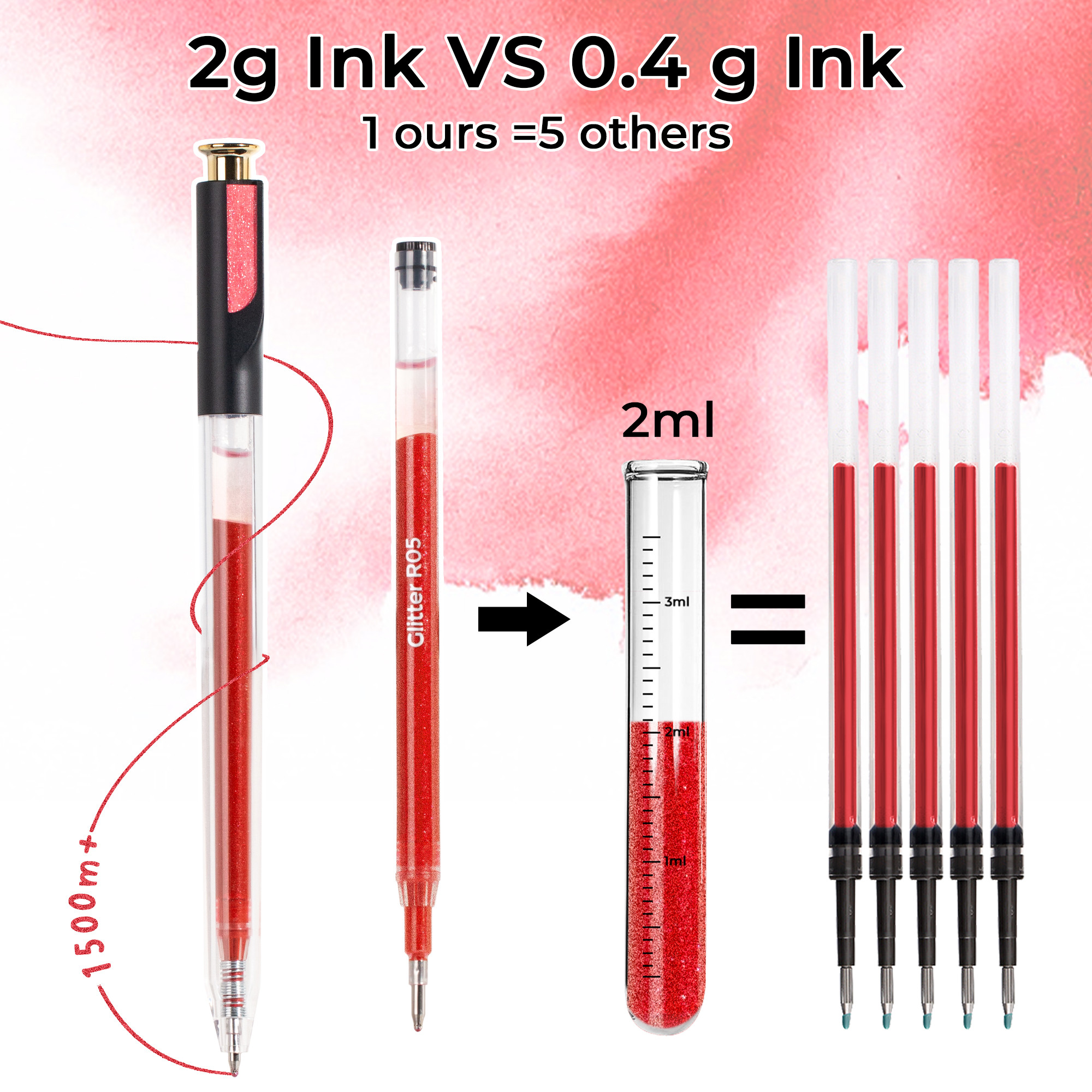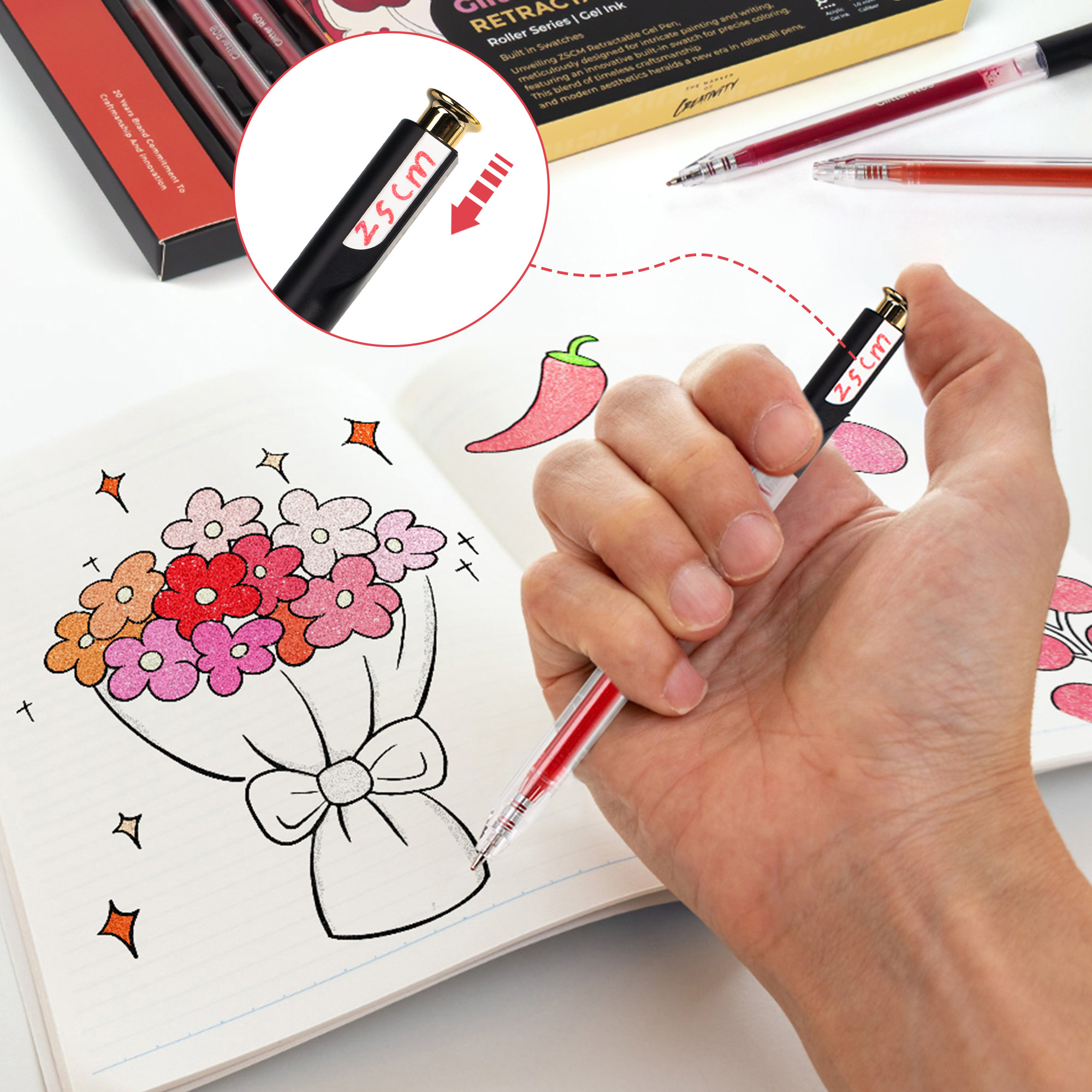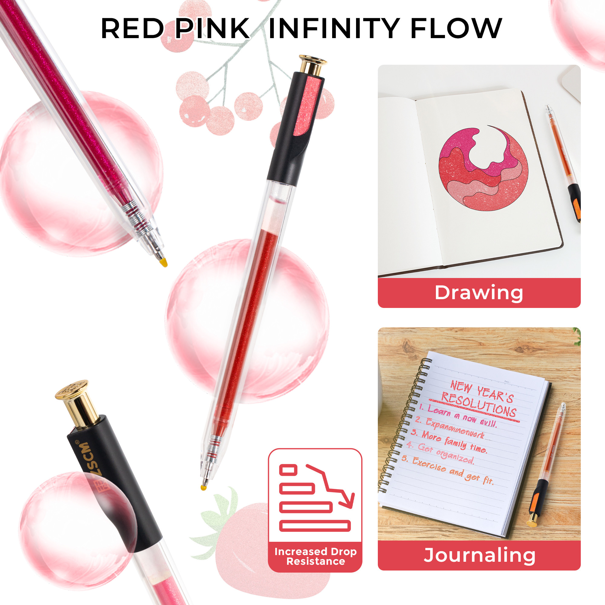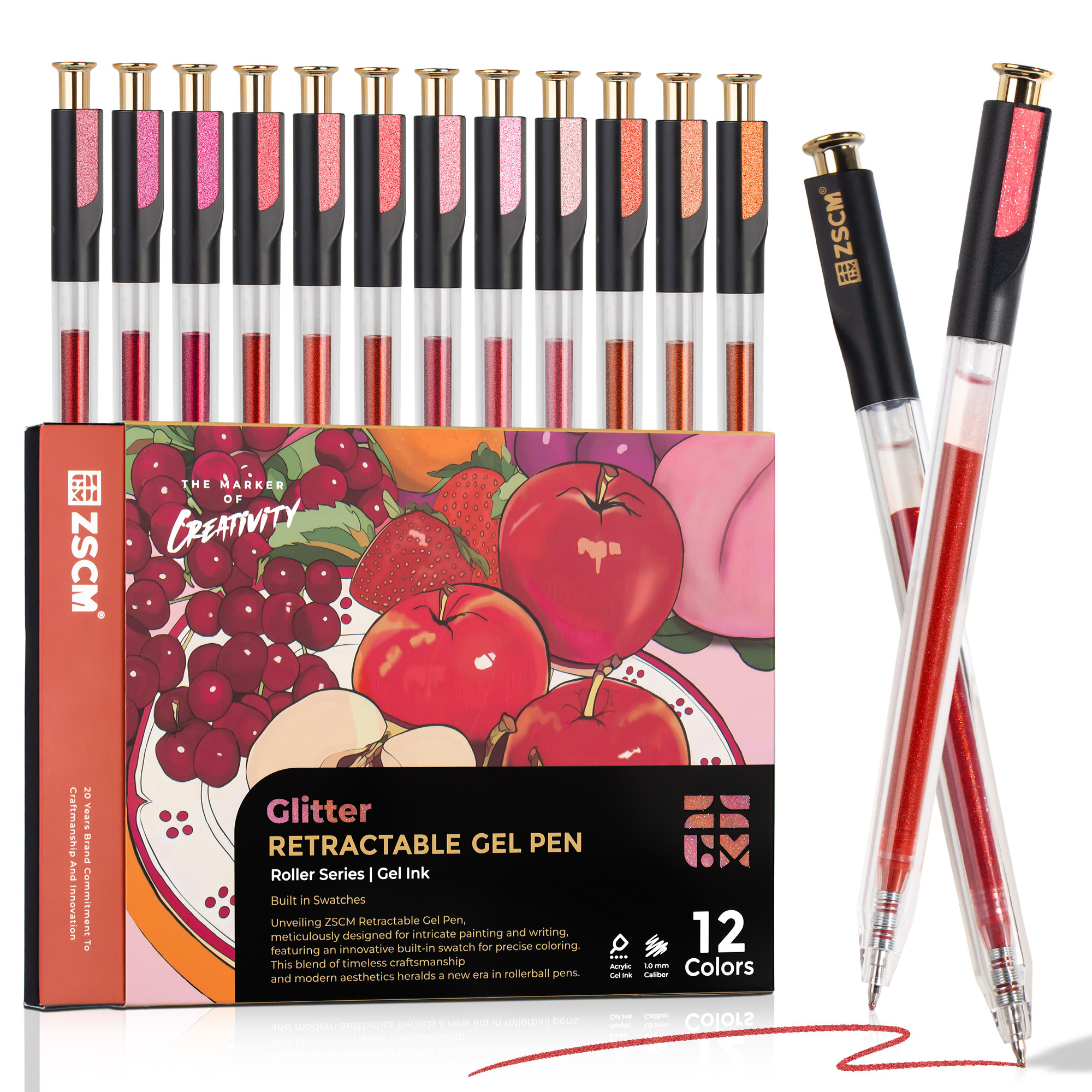 - The ZSCM Pink Retractable Glitter Gel Pen Set features 12 dreamy shades from soft ballet pink to bold magenta. With a smooth retractable mechanism and 1.0mm precision tip, these pens deliver rich, sparkling ink perfect for wedding invitations, love journals, and floral illustrations. The high-density glitter formula ensures vibrant color payoff every time.