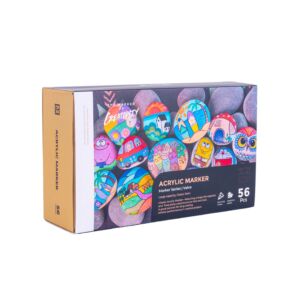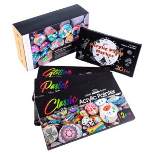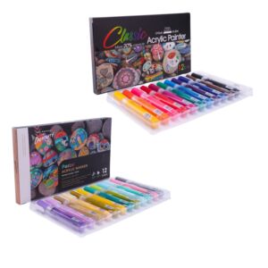 Acrylic Markers feature high-pigment, quick-dry metallic ink compatible with diverse surfaces like rocks, glass, fabric, and ceramics.